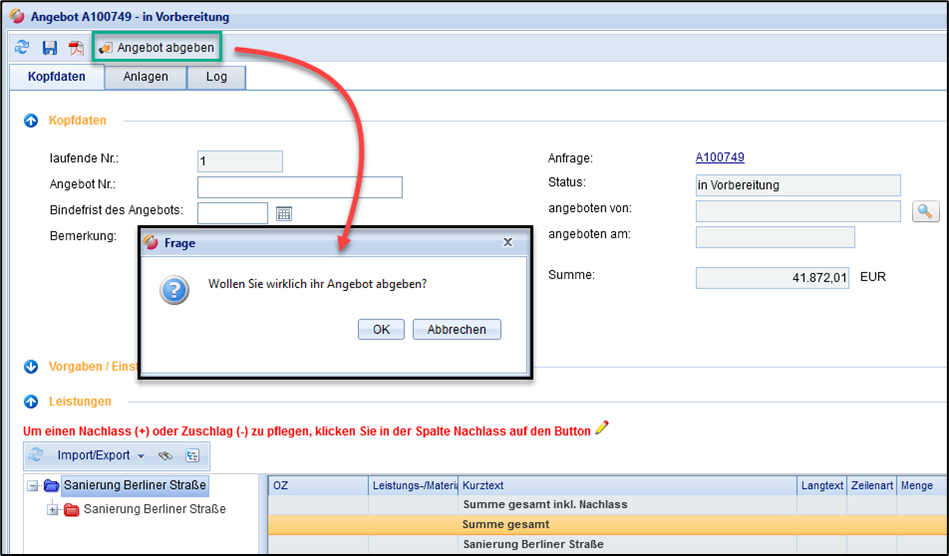 Haben Sie Ihr Angebot vervollständigt, so können Sie es an den Auftraggeber übermitteln.