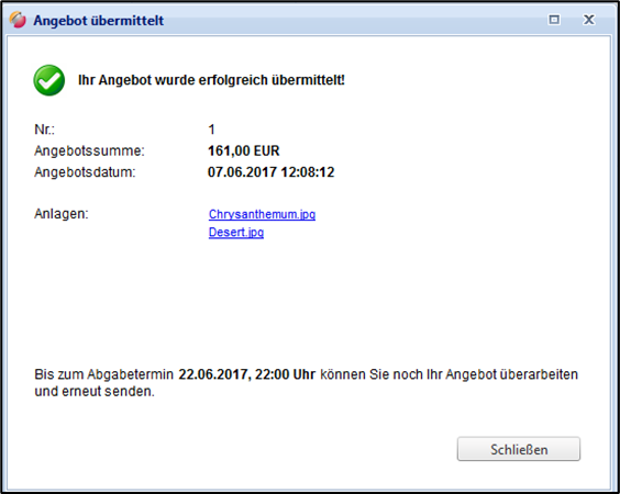 Wurde das Angebot erfolgreich übermittelt, erscheint folgende Meldung: