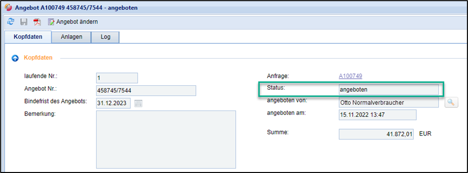 5. Nach dem Schließen des Fensters wechselt der Status des Angebots von „In Vorbereitung“ in „angeboten“.