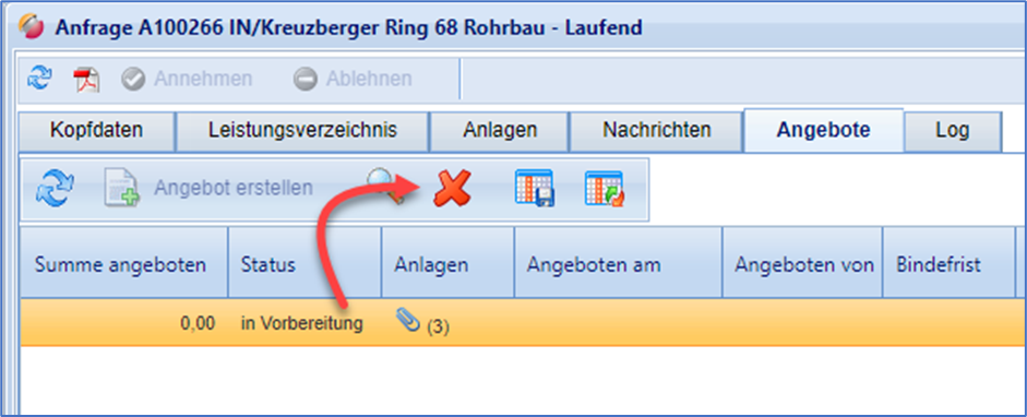 Sie können nur Angebote im Status „in Vorbereitung“ löschen, also solche, die Sie noch nicht an den Auftraggeber übermittelt haben. Nach der Übermittlung eines Angebots können Sie es lediglich überarbeiten und erneut senden, aber nicht löschen.