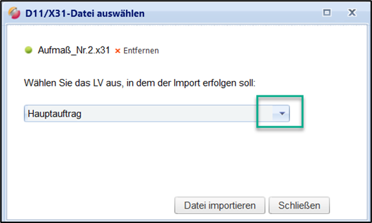 Für den Import einer DA11- oder X31-Aufmaßdatei wählen Sie die Auftragsposition im Auswahlfenster aus zu der der Import erfolgen soll:
