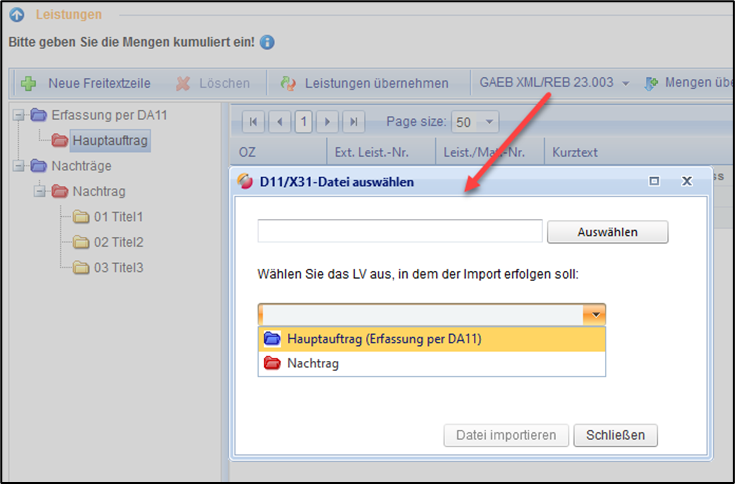 · Zuvor gepflegte Mengen werden durch den Import einer DA11- oder X31-Aufmaßdatei überschrieben.