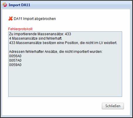 Sollte die DA11- oder X31-Datei fehlerhaft sein, so wird der Importvorgang abgebrochen und Sie erhalten ein Fehlerprotokoll angezeigt: