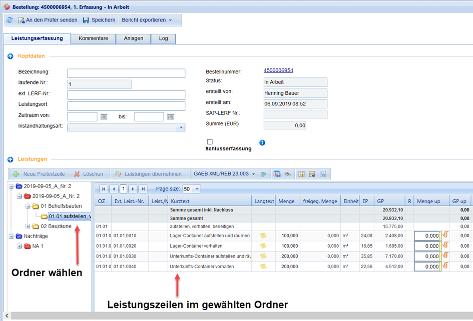 Sollte es sich um eine Bestellung mit konkreter Leistungsbeschreibung handeln, so wird das Auftrags-LV in der Tabelle des Erfassungsblatts direkt angezeigt.