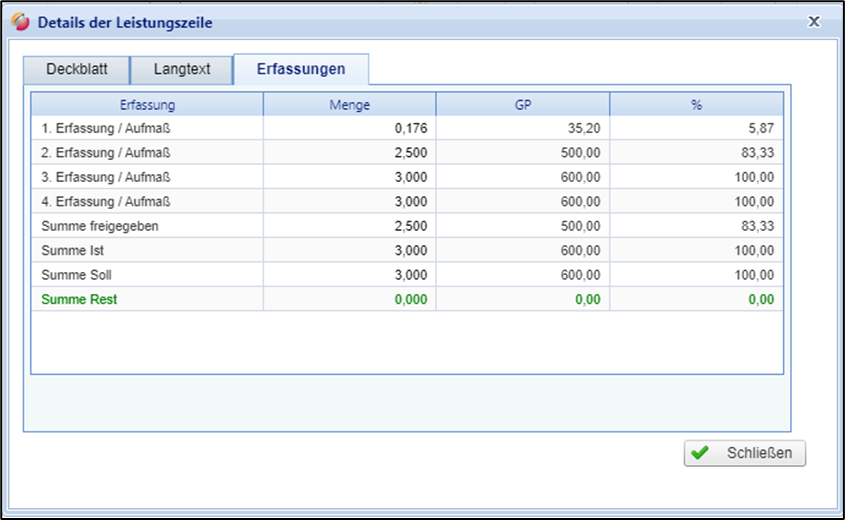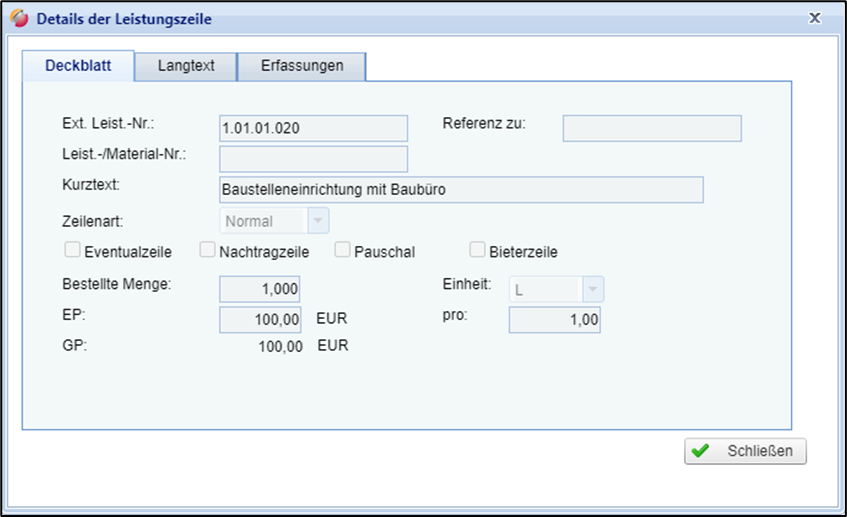Per Doppelklick auf eine Leistungszeile können Sie sich die zugehörigen Details anzeigen lassen. Die Details sind unterteilt in die drei Registerkarten „Deckblatt“, „Langtext“ und „Erfassungen“.