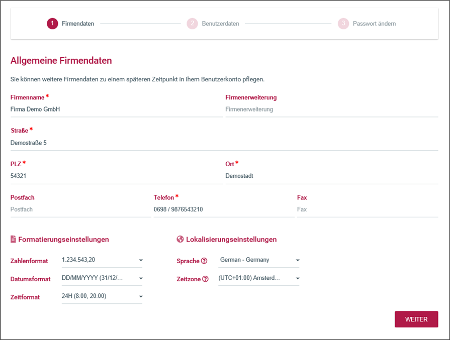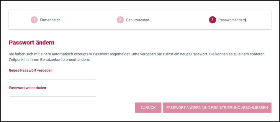 Bei einem neu angelegten Firmenzugang und/oder Benutzer ist es notwendig, dass Sie zunächst die Firmen- und Benutzerdaten pflegen und somit die Registrierung Ihres Unternehmens durchführen.
