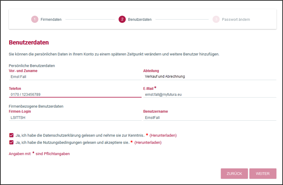 Neben der Pflege der Benutzerdaten müssen Sie zusätzlich die Datenschutzerklärung und die Nutzungsbedingungen zur Kenntnis nehmen.