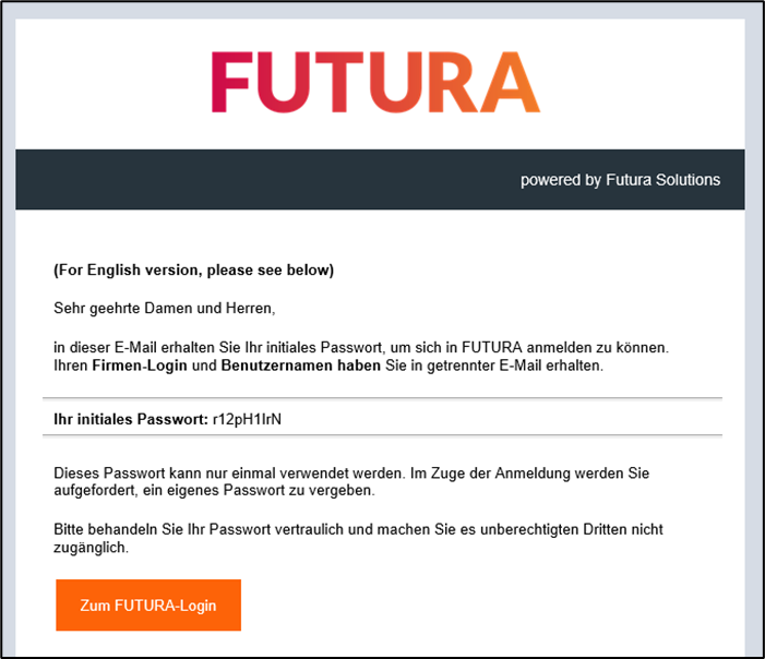 Betreff „Initiales Passwort für FUTURA / Initial password for FUTURA“