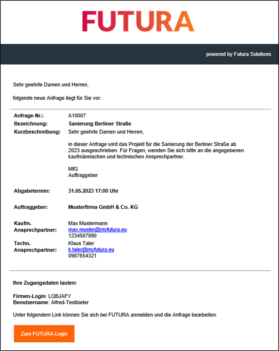 Zu jeder neuen Anfrage erhalten Sie automatisch eine Einladung per E-Mail. Darin enthalten sind auch die Zugangsdaten für FUTURA, um die Anfrage zu öffnen.