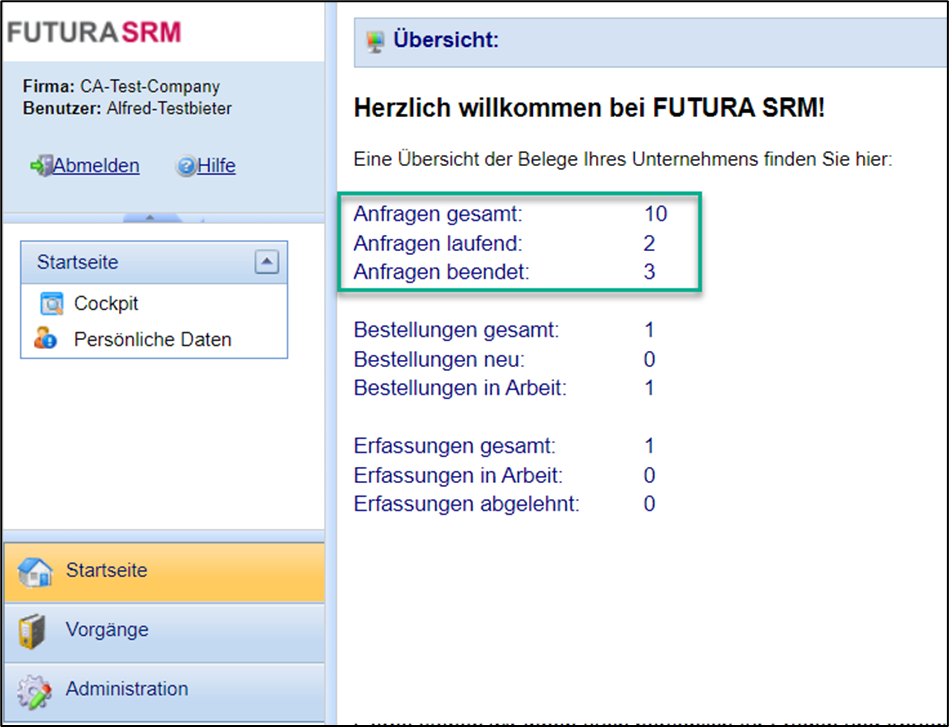 Öffnen Sie auf der Startseite die Liste der Anfragen durch einen Klick auf „Anfragen gesamt“ oder „Anfragen laufend“.