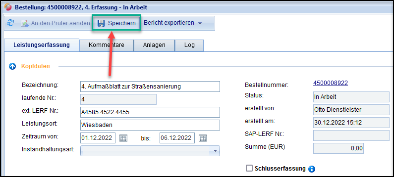 Kopfdaten der Leistungserfassung pflegen