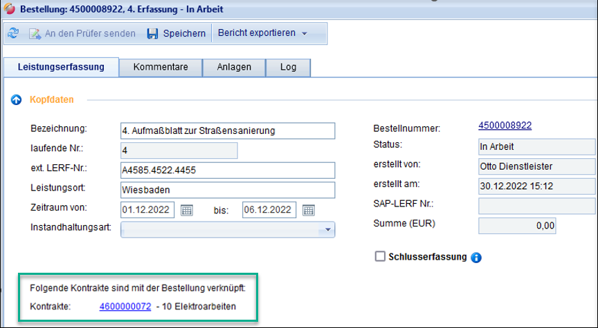 Kontraktzuordnung in der Leistungserfassung