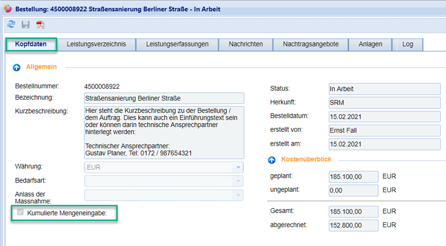In der Bestellung kann die Option „kumulierte Mengeneingabe“ vom Auftraggeber vorgegeben sein. Sie als Auftragnehmer können dies nicht verändern. Dies hat zur Folge, dass Sie die Menge kumuliert eingeben müssen. D.h., dass Sie bereits abgerechnete Mengen aus vorherigen Erfassungsblättern in die Menge des aktuellen Erfassungsblatts mit einkalkulieren müssen. Ob die Option aktiv ist, sehen Sie in der Bestellung, in der Registerkarte „Kopfdaten“: