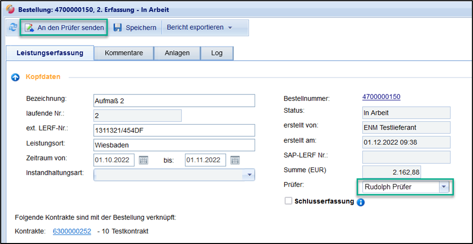 Von Ihnen fertig gestellte Leistungserfassungen müssen zur Prüfung an den Auftraggeber / Prüfer übermittelt werden. Vergewissern Sie sich, dass Sie alle bisher erbrachten Leistungen ordnungsgemäß erfasst haben. Abhängig von den Einstellungen Ihres Auftraggebers können Sie den „Prüfer“ festlegen, an den die Leistungserfassung versendet werden soll. Um die im Auswahlfenster dargestellte Leistungserfassung zu übermitteln, klicken sie auf den Button „An den Prüfer senden“.