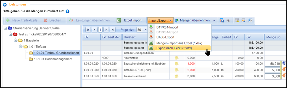 Leistungserfassung nach Excel exportieren / Mengen per Excel importieren