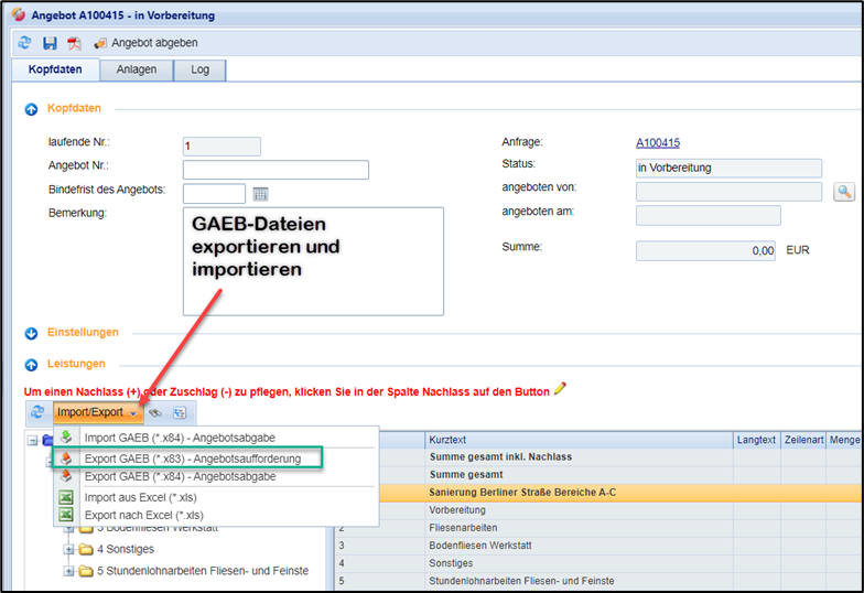 Leistungsverzeichnis als GAEB DA83-Datei exportieren und Angebotspreise per DA84-Datei importieren