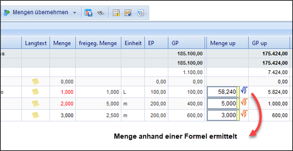 Schließen Sie nach Ihrer Eingabe das Fenster mit „OK“. Die Summe ihres Mengenansatzes wird nun im Mengenfeld angezeigt. Als Hinweis auf einen Mengenansatz zu der Leistungszeile erscheint das Formelzeichen jetzt in blauer Farbe: