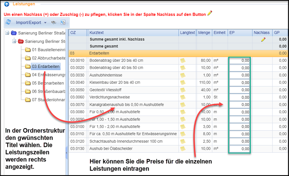 Öffnen Sie links den Gliederungsbaum, bis Sie rechts die gewünschten Leistungszeilen sehen. Dort können Sie in der Spalte „EP“ die Preise zu den einzelnen Leistungen eintragen.
