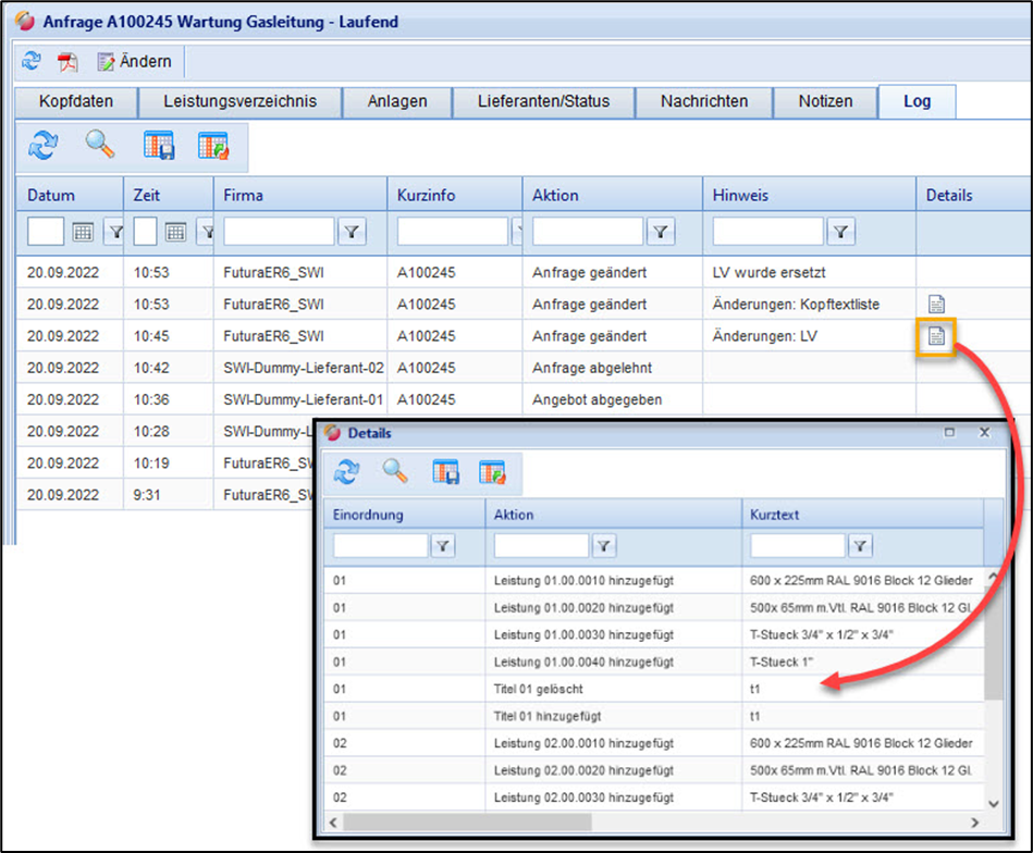 Genauere Details zu einer Änderung können Sie auf der Registerkarte „Log“ mit dem Button einsehen. Hat der Auftraggeber z.B. Änderungen am Leistungsverzeichnis durchgeführt, können Sie über den Details-Button in einem separaten Dialogfenster das gesamte Änderungsprotokoll einsehen.