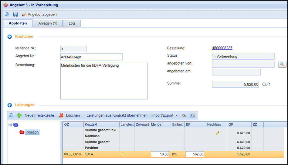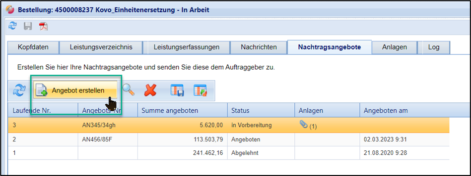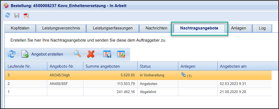 Eine Übersicht eingereichter Nachtragsangebote finden Sie auf der gleichnamigen Registerkarte. Es können mehrere Nachtragsangebote versendet werden. Über die Registerkarte Anlagen können Sie Ihrem Nachtragsangebot zudem Anlagen hinzufügen.