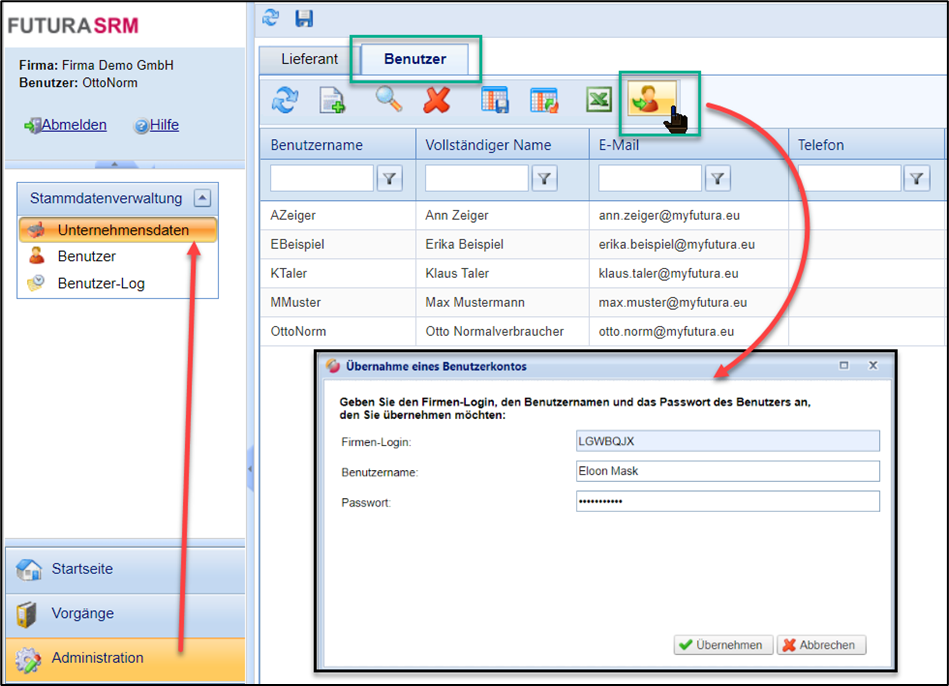 Rufen Sie unter Administration und Unternehmensdaten den Reiter „Benutzer“ auf. Klicken Sie dann auf den Button „Übernehmen eines Benutzerkontos“. Es öffnet sich daraufhin ein Dialogfenster, in dem Sie die Zugangsdaten des anderen Firmenzugangs eingeben können.