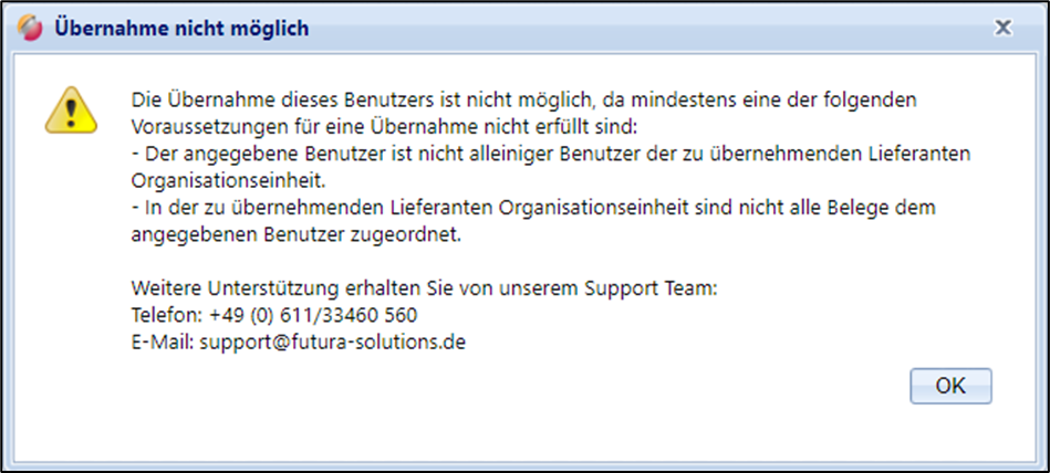 Hinweismeldung bei Übernahme eines Benutzerkontos