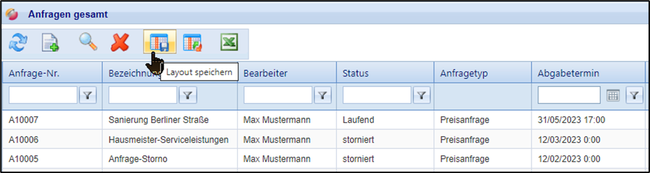 Um Änderungen an den Tabelleneinstellungen zu speichern, drücken Sie den Button „Layout speichern“.