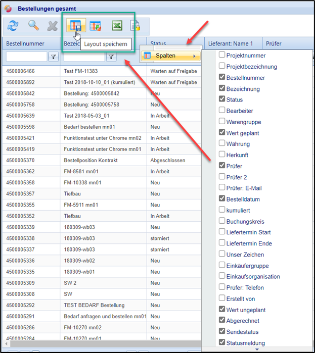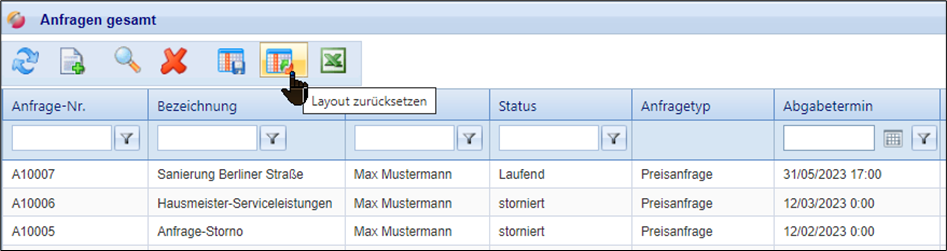 Mit dem Button „Layout zurücksetzen“ können Sie ALLE gesetzten Layouteinstellungen (hierzu zählen: Spaltenanzeige, Reihenfolge, Sortierung und gesetzte Filter) wieder auf die Default-Einstellungen zurückzusetzen.