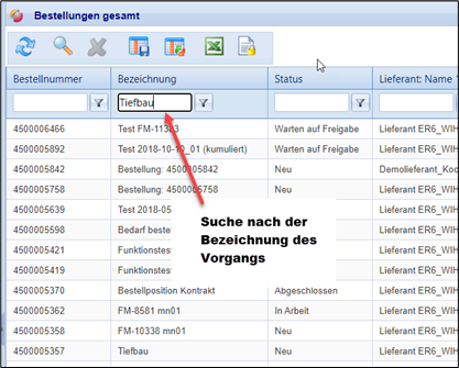Im nachfolgenden Beispiel, wird Ihnen anhand der Liste “Bestellungen gesamt” die Funktionen erläutert. Die Spaltenoptionen können in den verschiedenen Listen je nach Vorgangstyp variieren.