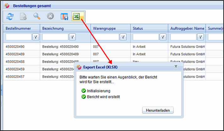Im Export-Bericht werden nur die angezeigten Daten exportiert, d.h. Filter- Spalten-, Sortiereinstellungen werden berücksichtigt. In Excel stehen Ihnen alle bekannten Funktionen zur weiteren Bearbeitung der Listen zur Verfügung.