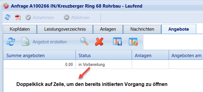 Once you have clicked on the "Create quotation" button, the process is created. Therefore, the button "Create quotation" is inactive and can no longer be selected again. If you leave the request and e.g. want to continue processing the quotation at a later date, return to the "Quotations" tab and double-click on the already created record to open it again.