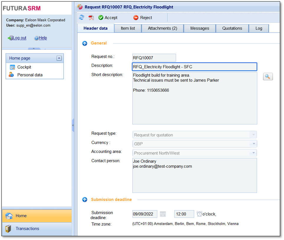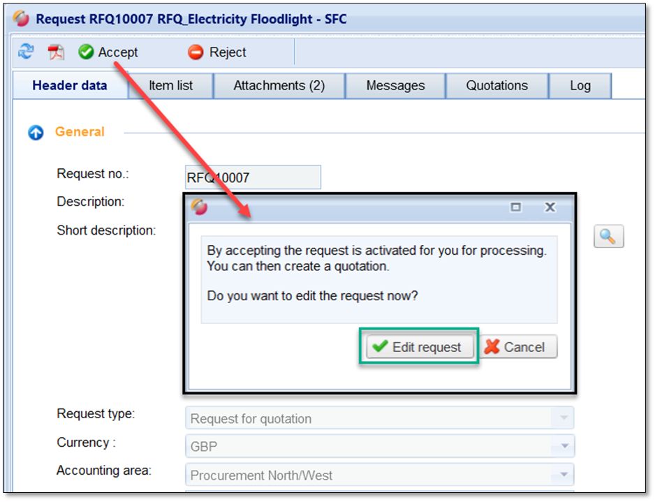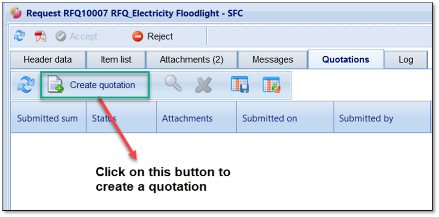 In order to be able to create a Quotation for the request, you must first accept the the participation. If you do not wish to submit a Quotation for the request, you can reject the request.