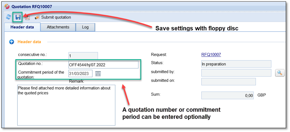 The editing area opens to maintain the quotation. Optionally, you can enter and save a Quotation number and a binding period in the header data.