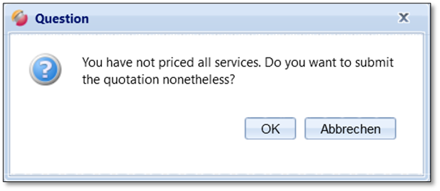 If you have not priced all services, you will be informed. You can then cancel the process and maintain the missing prices or submit your Quotation with OK