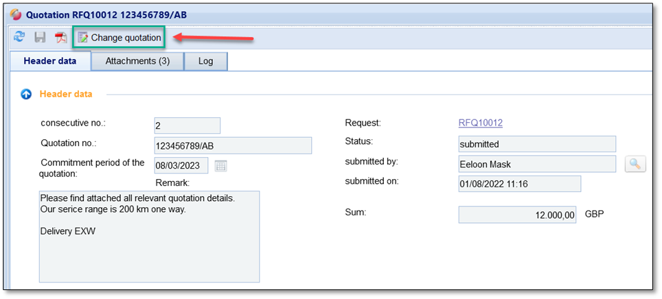 Your Quotation will be activated for processing, you can now revise prices or add further attachments, for example. When you have completed your changes, you can either submit your modified Quotation (using the button "Submit changed Quotation"). or discard your changes (using the "Dismiss changes" button).