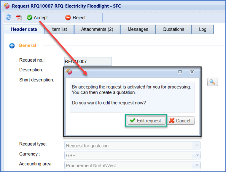 Use the "Accept" button to inform the client that you would like to participate in the request and submit an quotation. The client will be informed by e-mail about the acceptance of the request.
