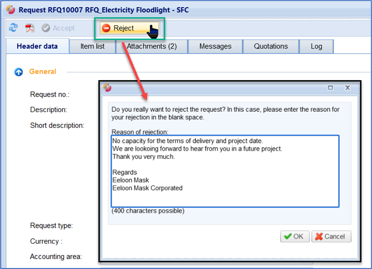 Use the "Decline" button to inform the client that you are not participating in the request. You can send him information about the reason for your rejection. The client will be informed of the rejection by e-mail. Even if you have rejected the request, you can still accept it afterwards and make a quotation.