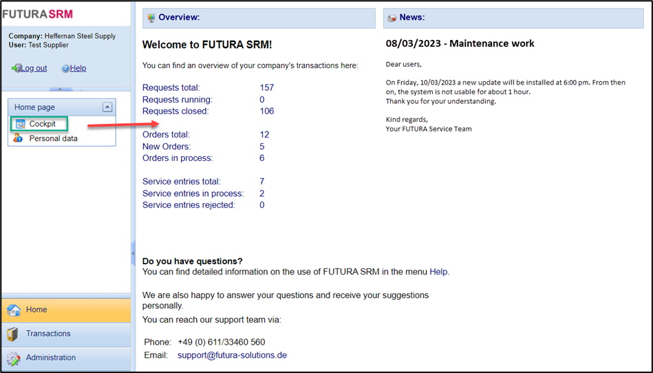 Cockpit and Transactions menu