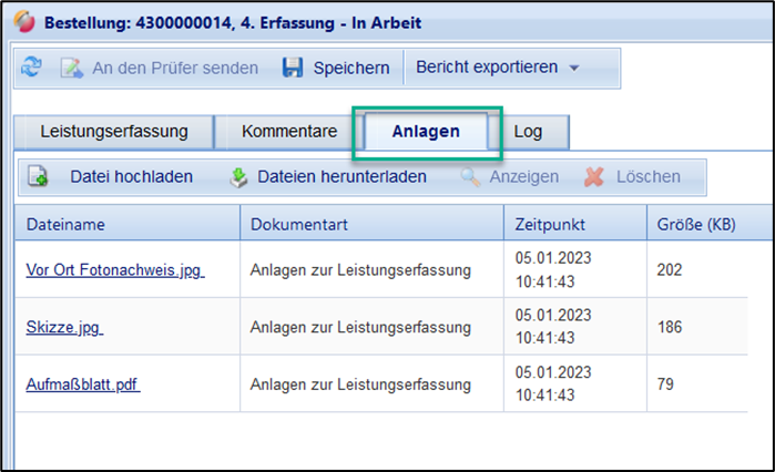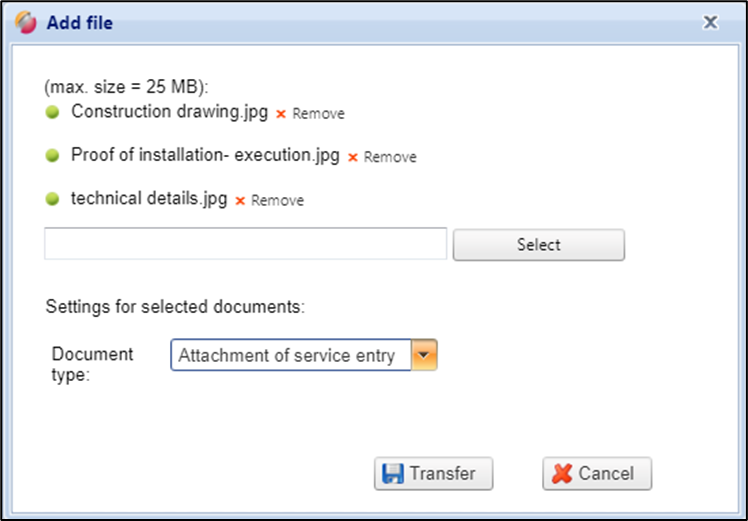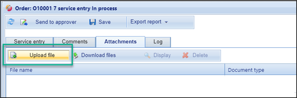 Under the tab "Attachments" you can add relevant documents (e.g., service certificates) to the service entry. These are sent to the approver with the service entry. If the approver also assigns documents to the service entry, you can also see these documents here.