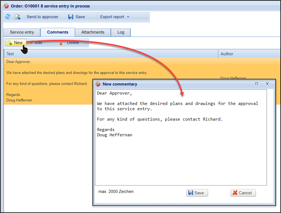 The addition, editing or deletion of comments/attachments is only possible if the service entry has not yet been transmitted to the approver.