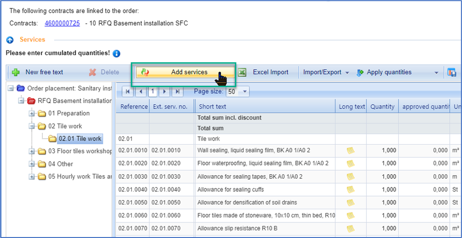 The entry of quantities for service entries must be made either cumulatively or non-cumulative. This is a default setting that the purchaser specifies in the order. The rules for both variants can be found here: Applied rules in the service entry process