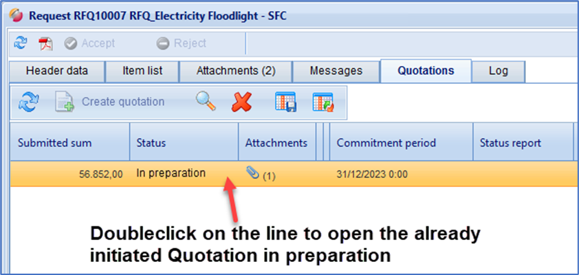 Once you have clicked on the "Create quotation" button, the process is created. Therefore, the button "Create quotation" is inactive and can no longer be selected again. If you leave the request and, for example, want to continue processing the quotation later, return to the "Quotations" tab and click on the already created data record with a double click.
