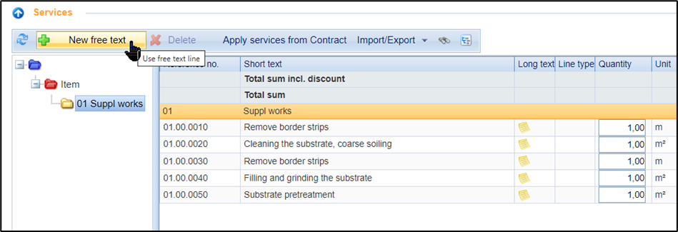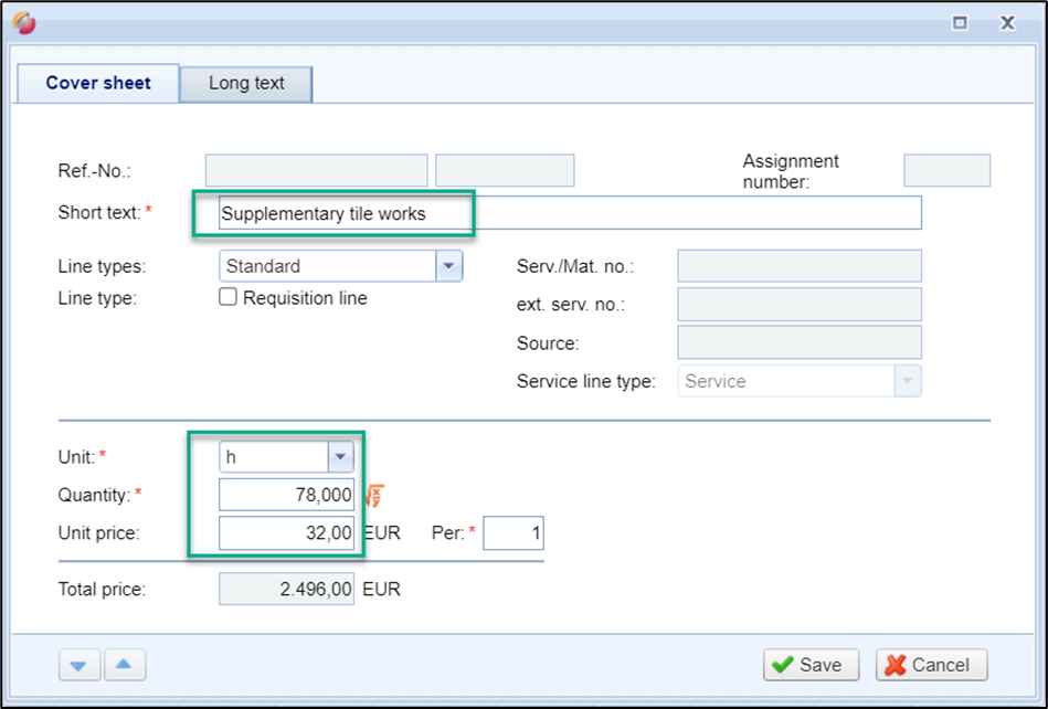 A window opens with two index cards (cover page, long text) in which you can describe your required service. Fill in all fields marked with an asterisk (*). In the tab "Long text" you can enter a more detailed description of the service line.