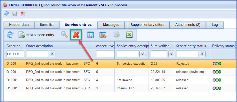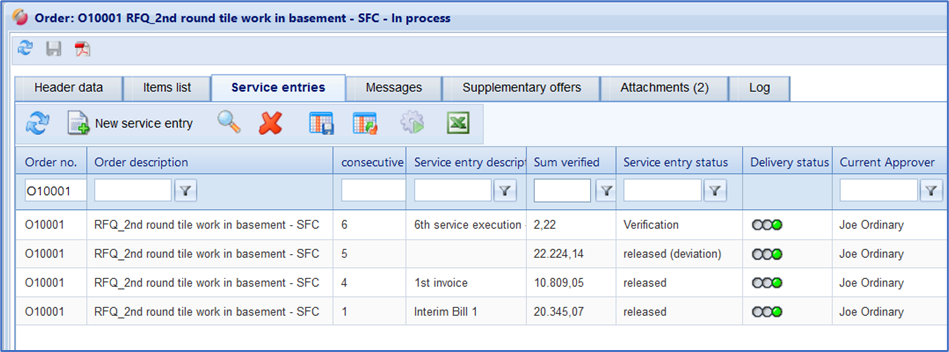 Open the desired purchase order and switch to the tab "service entries". Here you have the possibility to create your first or further service entries, to edit existing ones, to revise rejected ones or to delete existing ones. You can create and edit any number of service entries for a purchase order.