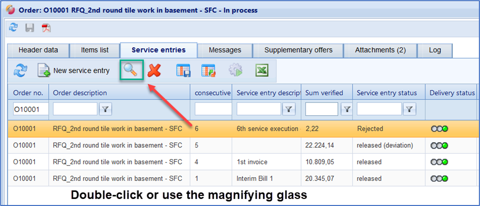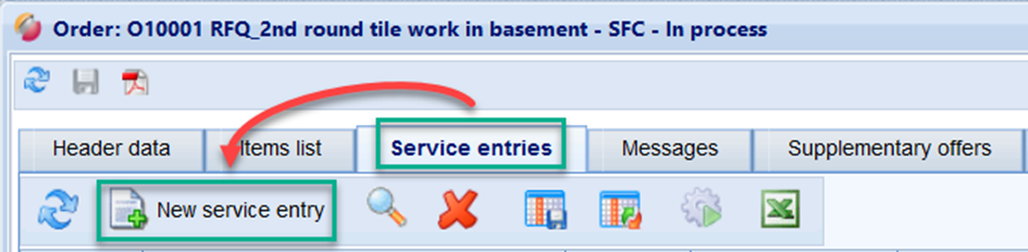 Open an order and switch to the tab "service entries".