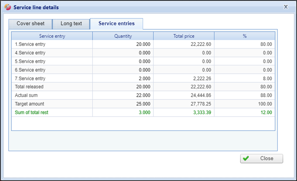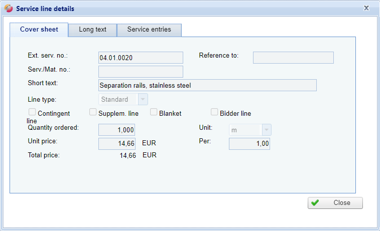 By double-clicking on a service line, you can display the corresponding details. The details are divided into the three tabs "Cover sheet", "Long Text" and "service entries".