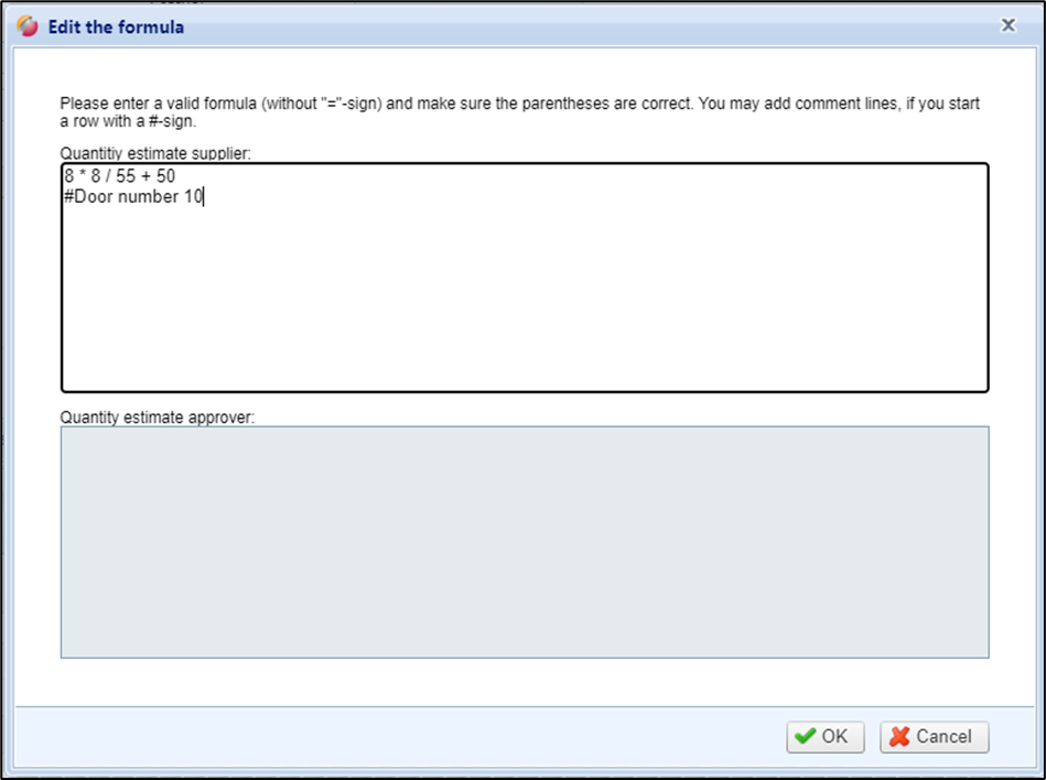Instead of entering quantities directly, you also have the option of entering the services provided in the form of a quantity approach. To do this, please press the corresponding symbol behind the quantity field. The "Edit Formula" window opens, where you can enter your quantity approaches.