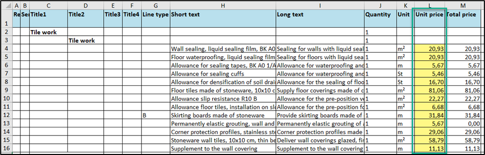 In the exported Excel items list file, you can insert your unit prices in the column “Unit price”.
