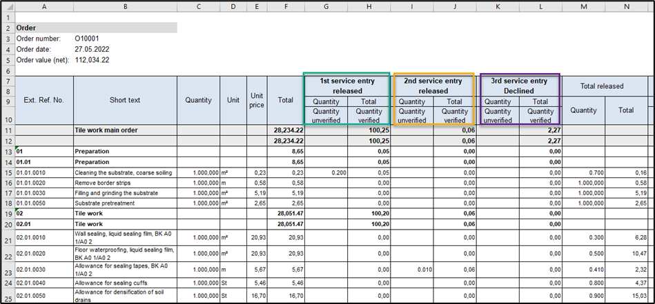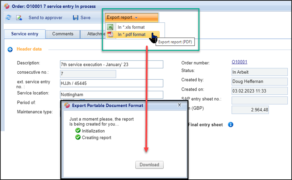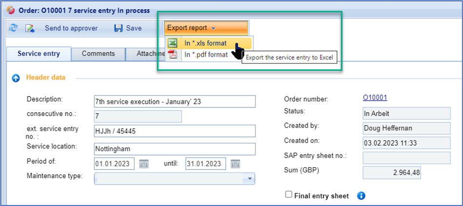 service entry reports can also be exported as a PDF file. Select the command "in the format *pdf":