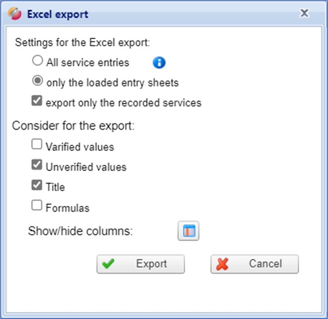 Titles: All title structures of the service entry are taken into account in the export. If not checked, the titles are hidden.